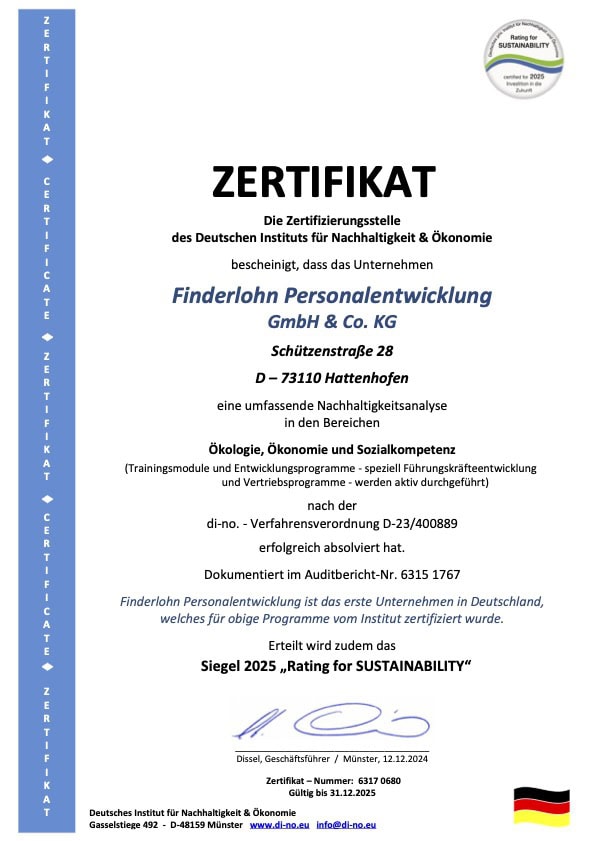 Unser Finderlohn Labor fff (fit for future) garantiert Ihnen, dass in Ihrer Lösung aktuellste, praxiserprobte Erkenntnisse, Werkzeuge und Module eingesetzt werden. Das einzigartige Finderlohn System und die eingesetzte DUAL-Methode sorgen dafür, dass die Teilnehmer sofort in der Lage sind das Erlernte, gewinnbringend und nachhaltig für Ihr Unternehmen, einzusetzen.